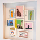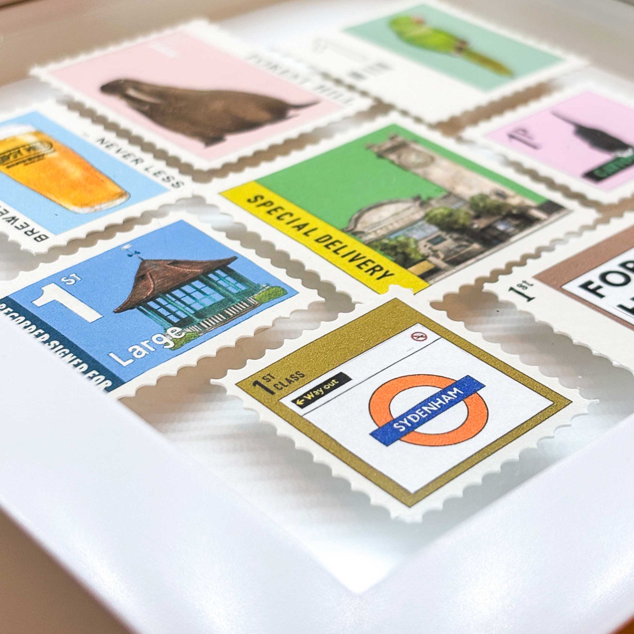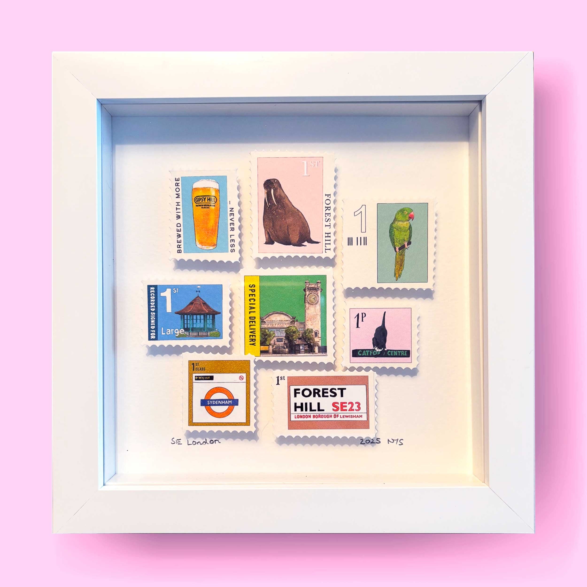Greetings from SE London. This charming framed stamp collage gives Forest Hill icons the spotlight and love they deserve. The stamp illustration is printed, hand-cut, and mounted on Italian Hammered Tintoretto Gesso paper, then signed by the artist. This beautiful handmade stamp celebrates the unique character of London's only neighbourhood with a walrus. Each mini print collage is handmade, so there may be slight variations in each framed piece. It’s presented in a white 3D acrylic frame with genuine glass.