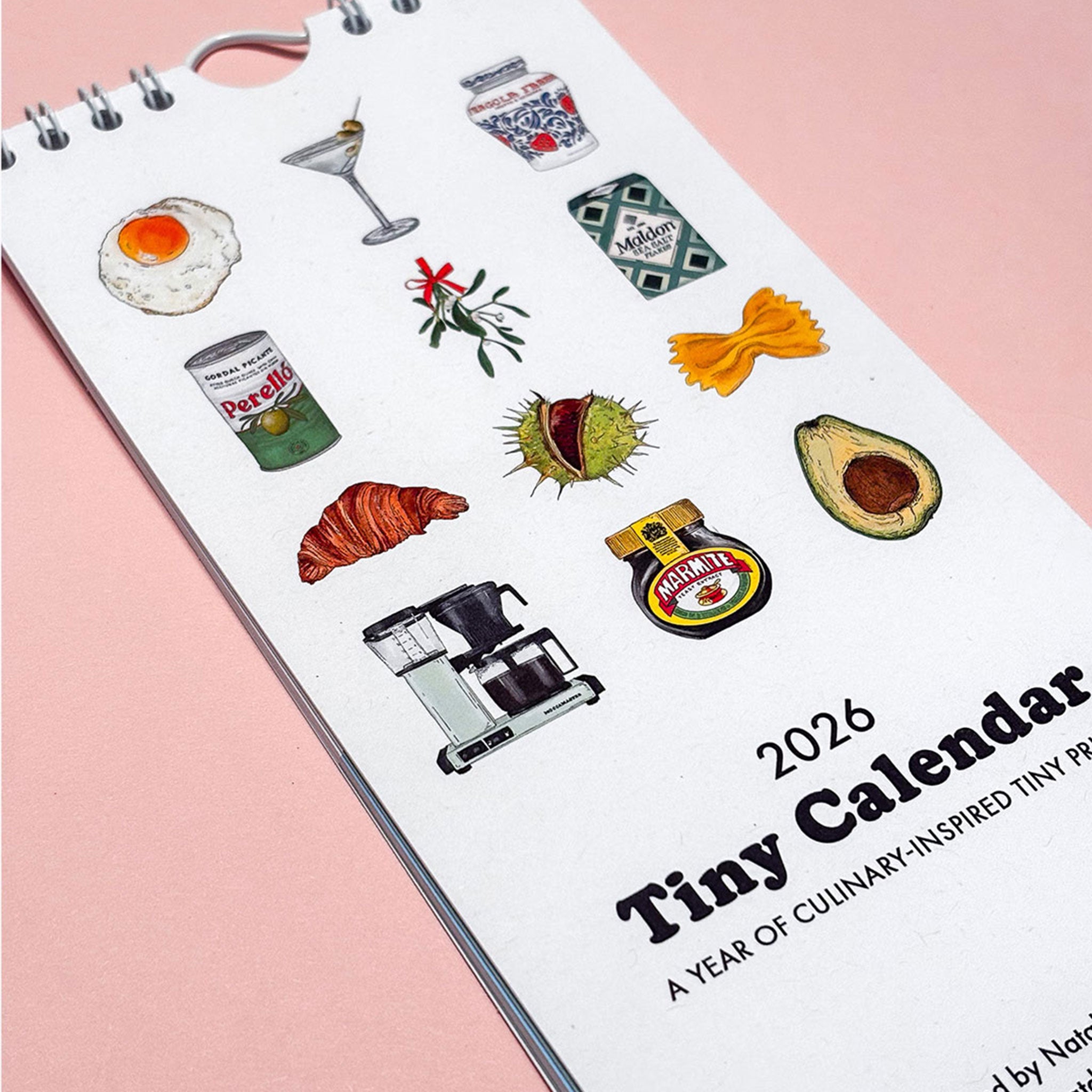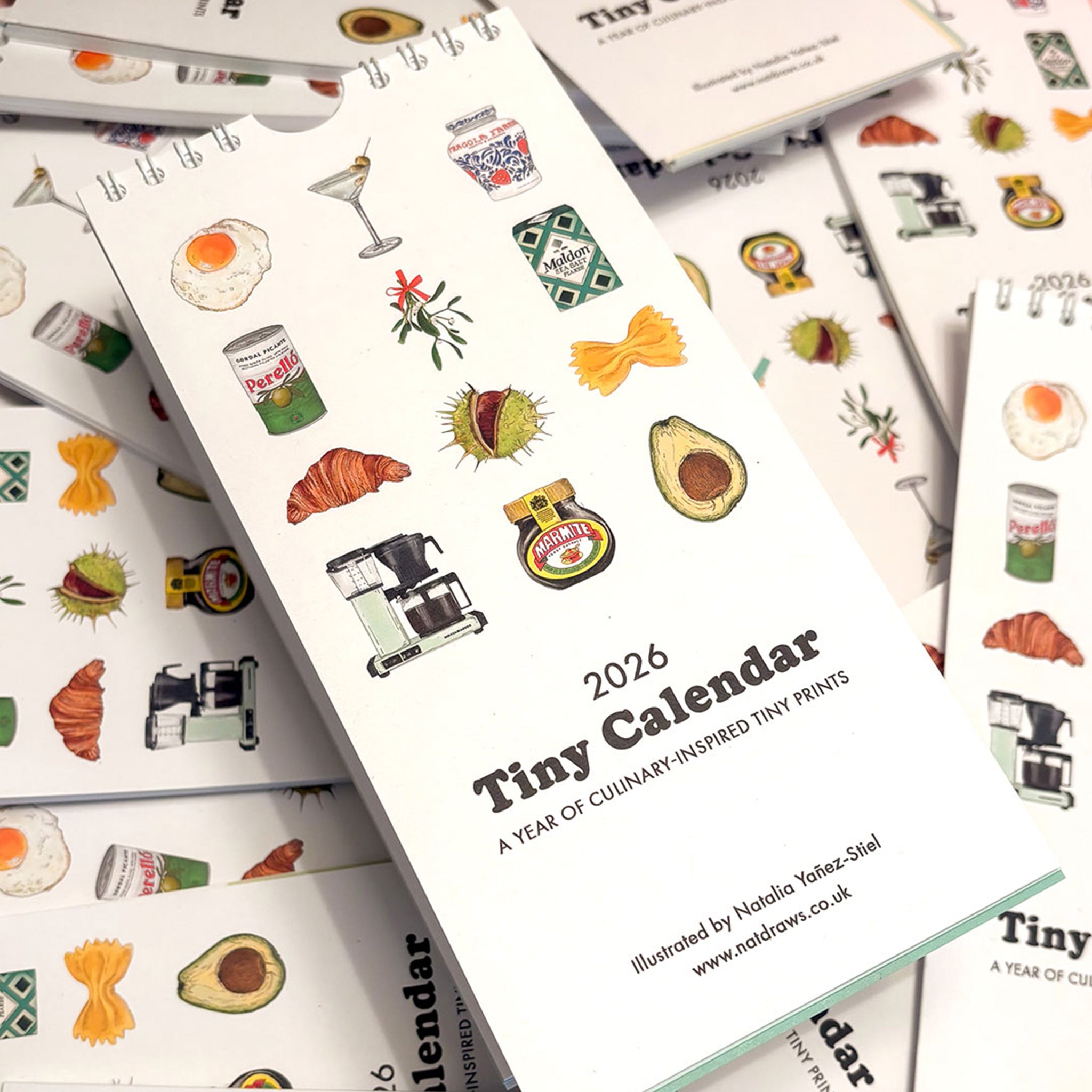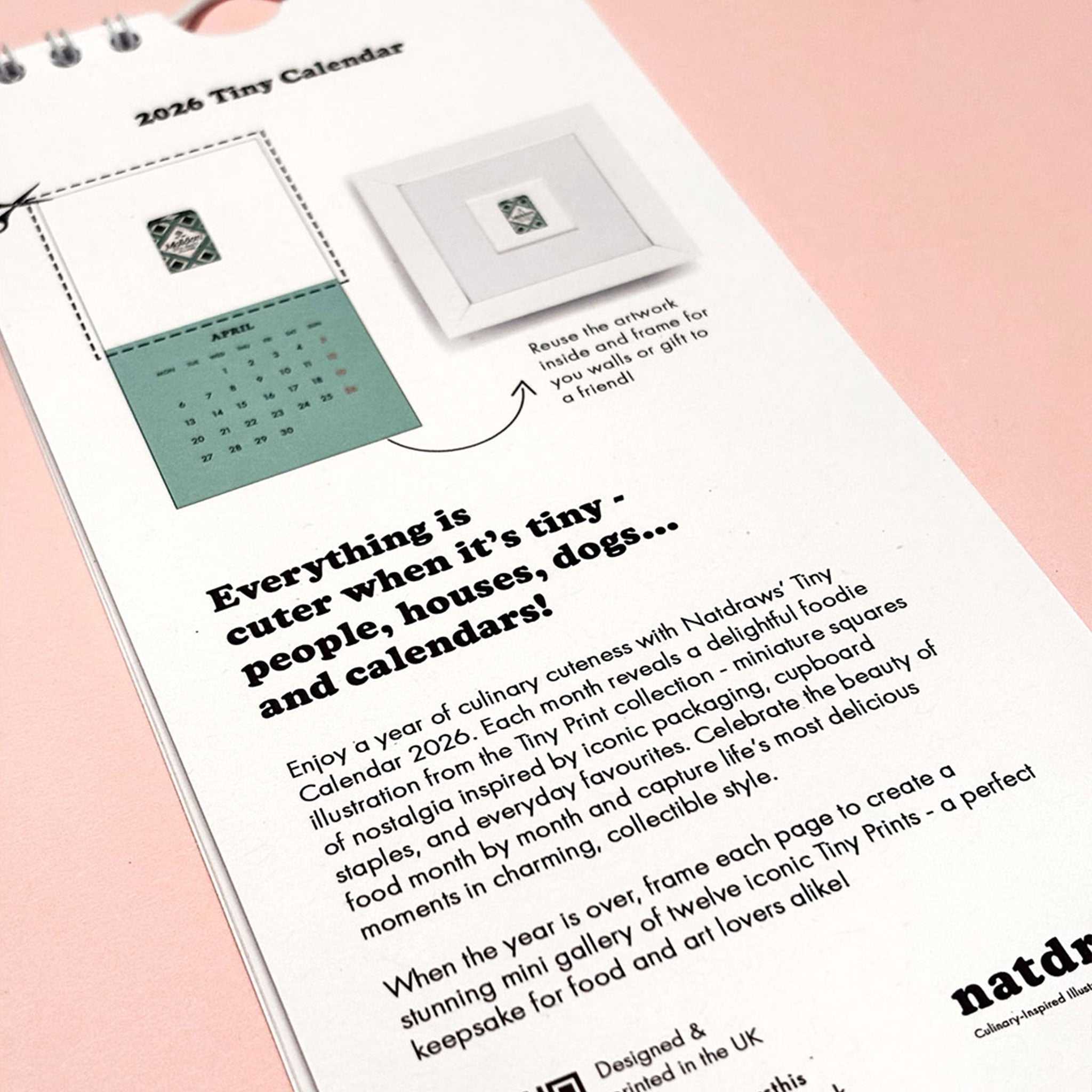 Enjoy a year of culinary cuteness with Natdraws’ Tiny Calendar 2026. Each month reveals a delightful foodie illustration from the Tiny Print collection - miniature squares of nostalgia inspired by iconic packaging, cupboard staples, and everyday favourites. Celebrate the beauty of food month by month and capture life’s most delicious moments in charming, collectible style. When the year is over, frame each page to create a stunning mini gallery of twelve iconic Tiny Prints - a perfect keepsake for food and art lovers alike!